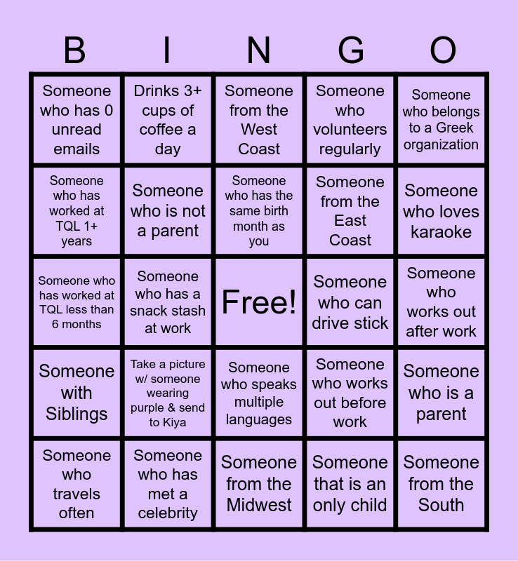 This bingo card has a free space and 24 words: Take a picture w/ someone wearing purple & send to Kiya, Someone who has met a celebrity, Someone who has the same birth month as you, Someone who travels often, Someone who belongs to a Greek organization, Someone who has 0 unread emails, Someone who has worked at TQL 1+ years, Drinks 3+ cups of coffee a day, Someone who can drive stick, Someone who speaks multiple languages, Someone from the East Coast, Someone who has worked at TQL less than 6 months, Someone who works out before work, Someone who is a parent, Someone who is not a parent, Someone that is an only child, Someone who works out after work, Someone from the West Coast, Someone who loves karaoke, Someone who has a snack stash at work, Someone from the South, Someone with Siblings, Someone who volunteers regularly and Someone from the Midwest.