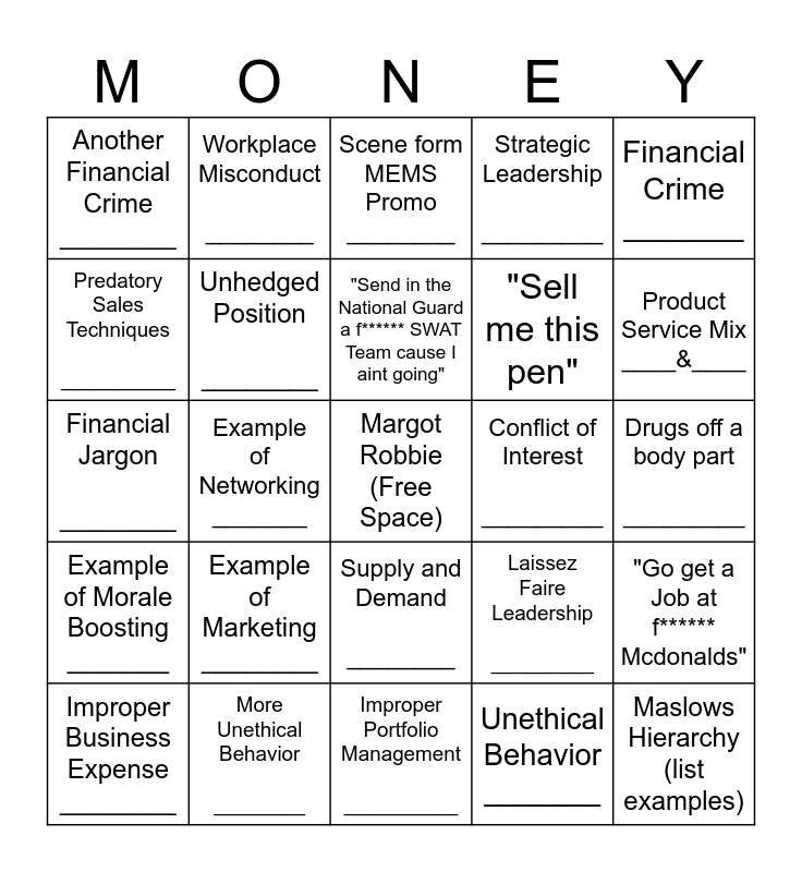 This bingo card has a free space and 24 words: Improper Business Expense ________, Example of Marketing ________, "Send in the National Guard a f****** SWAT Team cause I aint going", Unethical Behavior _______, Financial Crime _______, Another Financial Crime ________, Workplace Misconduct ________, Scene form MEMS Promo ________, Conflict of Interest _________, Drugs off a body part _________, Financial Jargon ________, Unhedged Position ________, Laissez Faire Leadership _________, "Go get a Job at f****** Mcdonalds", Predatory Sales Techniques __________, More Unethical Behavior ________, Improper Portfolio Management __________, Strategic Leadership _________, Product Service Mix ____&____, Example of Morale Boosting _______, Example of Networking _______, Supply and Demand ________, "Sell me this pen" and Maslows Hierarchy (list examples).