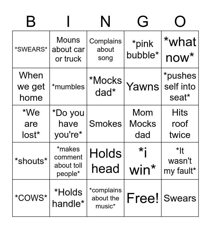 This bingo card has 30 words: *Holds handle*, Holds head, *Do you have you're*, *mm Hmm*, *SWEARS*, Complains about song, *mumbles, Holds head, Mom Mocks dad, *complains about the music*, Hits roof twice, Smokes, Free!, Swears, *pushes self into seat*, *Goes through red light*, *i win*, *shouts*, *makes comment about toll people*, *what now*, *We are lost*, *Where are we*, Mouns about car or truck, Yawns, When we get home, *pink bubble*, *It wasn't my fault*, *COWS*, *Mocks dad* and Someone uses a icebreaker.