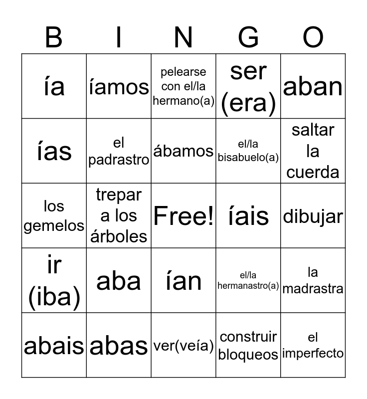 This bingo card has a free space and 24 words: aba, abas, ábamos, abais, aban, ía, ías, íamos, íais, ían, el/la bisabuelo(a), los gemelos, el/la hermanastro(a), la madrastra, el padrastro, construir bloqueos, dibujar, pelearse con el/la hermano(a), saltar la cuerda, trepar a los árboles, el imperfecto, ir (iba), ser (era) and ver(veía).