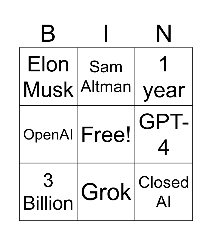 This bingo card has a free space and 10 words: Grok, 1 year, Elon Musk, Closed AI, OpenAI, 3 Billion, Sam Altman, AGI, GPT-4 and 3 years.