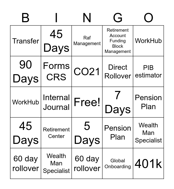 This bingo card has a free space and 47 words: Direct Rollover, 401k, PIB estimator, 60 day rollover, Retirement Center, 5 Days, 45 Days, Journal, 90 Days, Contributions, Forms CRS, Retirement Account Funding Block Management, Wealth Man Specialist, Pension Plan, OA12, CO32, CO21, 7 Days, Raf Management, WorkHub, Internal Journal, Global Onboarding, Transfer, Direct Rollover, 401k, PIB estimator, 60 day rollover, Retirement Center, 5 Days, 45 Days, Journal, 90 Days, Contributions, Forms CRS, Retirement Account Funding Block Management, Wealth Man Specialist, Pension Plan, OA12, CO32, CO21, 7 Days, Raf Management, WorkHub, Internal Journal, Global Onboarding, Transfer and Free!.