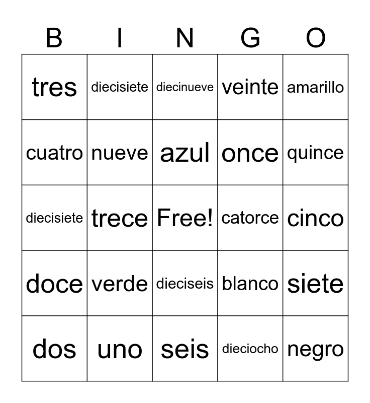 This bingo card has a free space and 24 words: verde, uno, azul, dos, amarillo, tres, cuatro, diecisiete, catorce, dieciseis, once, diecisiete, blanco, siete, nueve, dieciocho, cinco, diecinueve, quince, trece, negro, doce, veinte and seis.