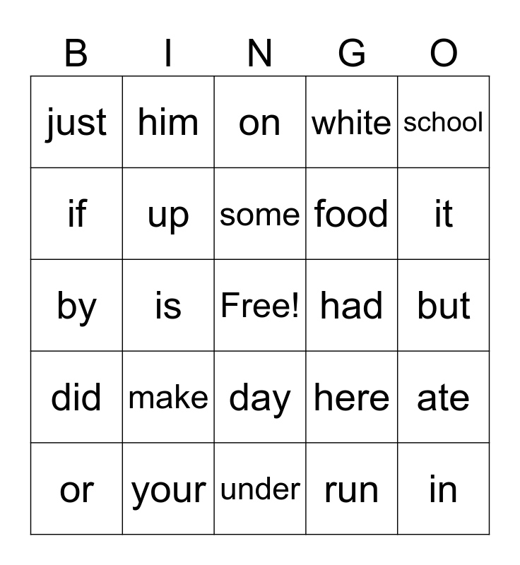 This bingo card has a free space and 24 words: make, your, some, or, school, just, if, him, had, day, food, by, here, ate, up, run, but, on, it, is, in, did, white and under.