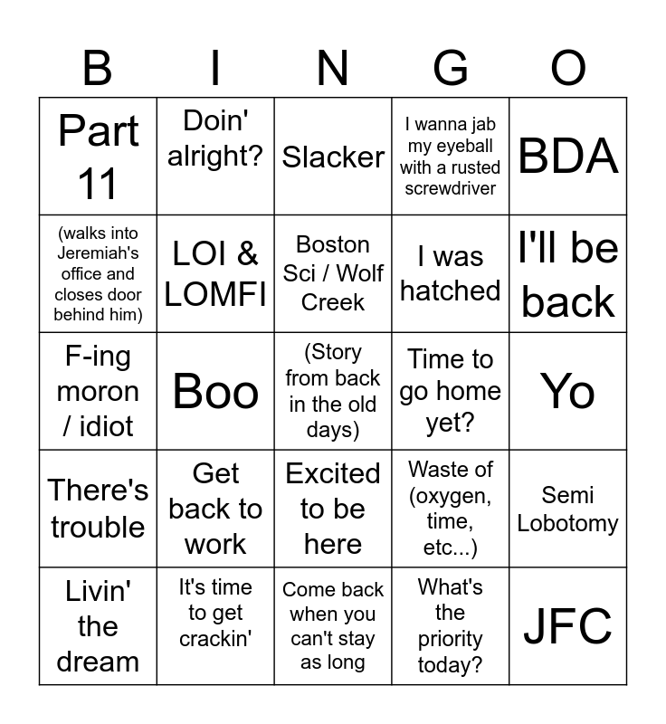 This bingo card has a free space and 29 words: Livin' the dream, Imma go burn one, Boo, Are we havin' fun yet?, Part 11, Slacker, LOI & LOMFI, Get back to work, Time to go home yet?, It's time to get crackin', Yo, JFC, Come back when you can't stay as long, What's the priority today?, I'll be back, Nope! & Wrong!, Excited to be here, There's trouble, BDA, F-ing moron / idiot, Waste of (oxygen, time, etc...), Alright, I'm out of here, I was hatched, (walks into Jeremiah's office and closes door behind him), I wanna jab my eyeball with a rusted screwdriver, Doin' alright?, Semi Lobotomy, Boston Sci / Wolf Creek and You're killing me.