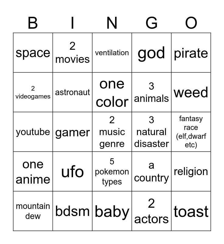 This bingo card has a free space and 24 words: ufo, bdsm, one color, mountain dew, pirate, space, 2 videogames, 2 movies, 3 natural disaster, 5 pokemon types, 3 animals, youtube, a country, religion, astronaut, 2 actors, fantasy race (elf,dwarf etc), ventilation, weed, gamer, toast, one anime, god and baby.