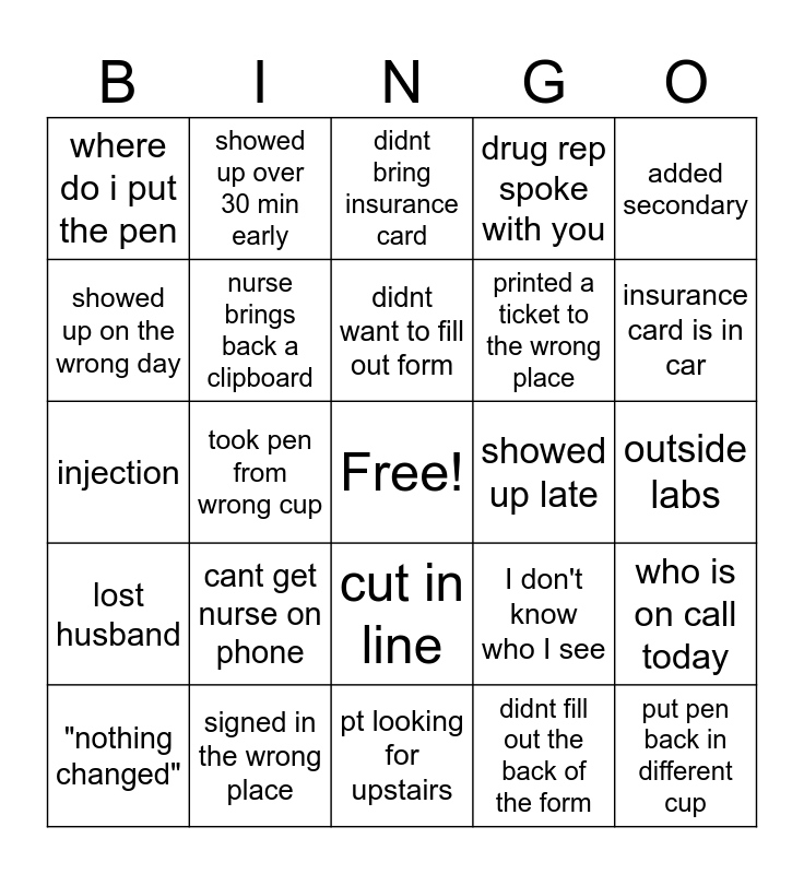 This bingo card has a free space and 24 words: cant get nurse on phone, signed in the wrong place, didnt want to fill out form, "nothing changed", added secondary, where do i put the pen, showed up on the wrong day, showed up over 30 min early, showed up late, cut in line, printed a ticket to the wrong place, injection, I don't know who I see, who is on call today, nurse brings back a clipboard, didnt fill out the back of the form, outside labs, didnt bring insurance card, insurance card is in car, took pen from wrong cup, put pen back in different cup, lost husband, drug rep spoke with you and pt looking for upstairs.