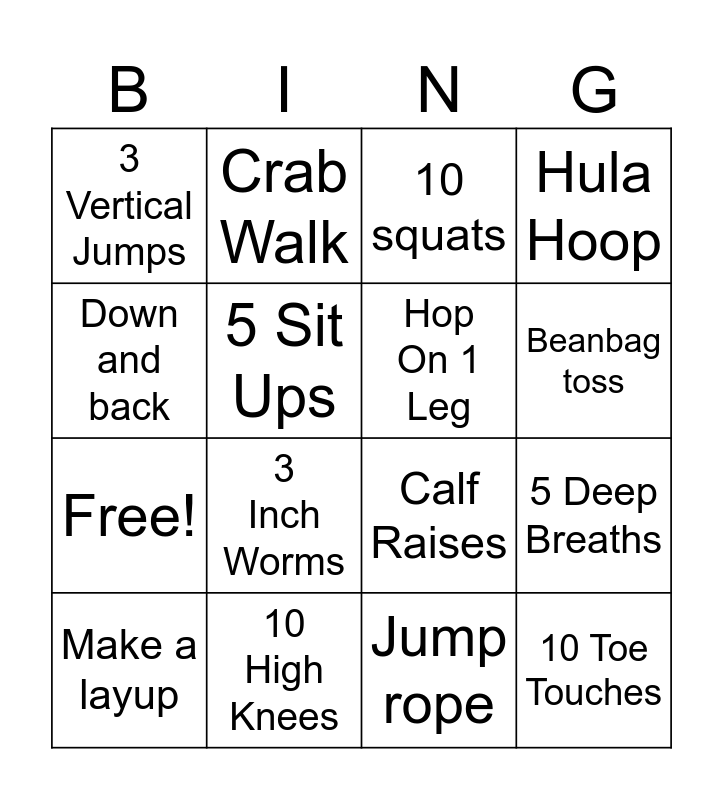 This bingo card has 20 words: 5 Deep Breaths, 10 Jumping Jacks, 10 squats, 5 push ups, Make a layup, Down and back, 10 High Knees, 3 Vertical Jumps, Free!, Crab Walk, 3 Inch Worms, Calf Raises, 5 Sit Ups, 10 Toe Touches, Hop On 1 Leg, 10 Arm Circles, Beanbag toss, Hula Hoop, Jump rope and 10 Mountain Climbers.