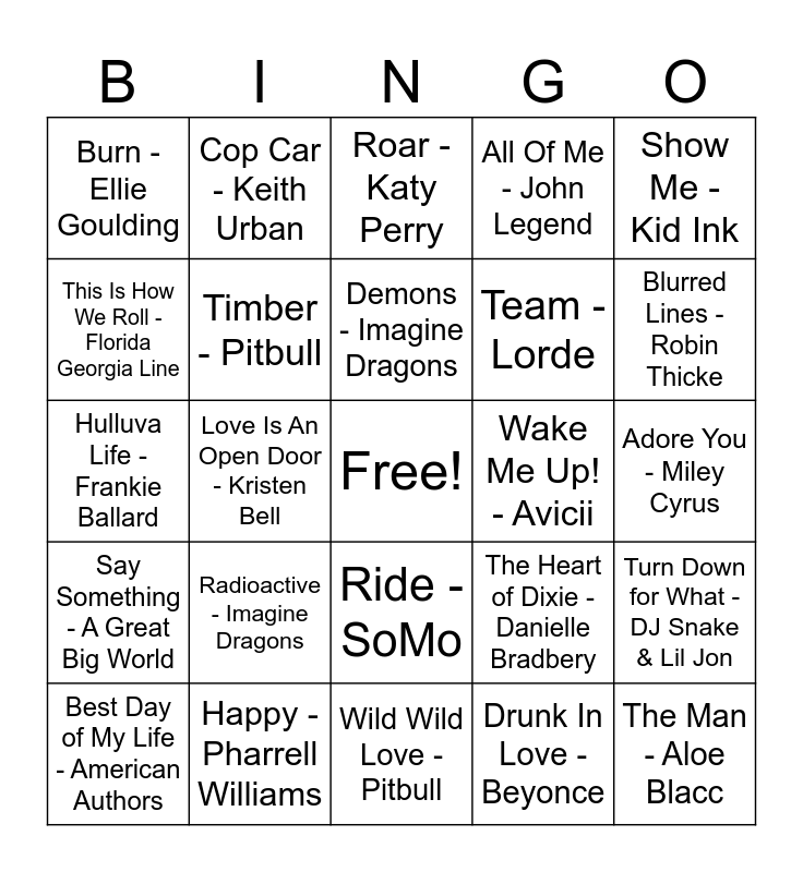This bingo card has a free space and 59 words: Dark Horse - Katy Perry, Happy - Pharrell Williams, Talk Dirty - Jason Derulo, Say Something - A Great Big World, Drunk In Love - Beyonce, Counting Stars - OneRepublic, Timber - Pitbull, Pompeii - Bastille, Team - Lorde, Summer - Calvin Harris, All Of Me - John Legend, Story Of My Life - One Direction, This Is How We Roll - Florida Georgia Line, The Monster - Eminem, Royals - Lorde, Burn - Ellie Goulding, The Man - Aloe Blacc, Show Me - Kid Ink, Let It Go - Idina Menzel, Demons - Imagine Dragons, Wake Me Up! - Avicii, Roar - Katy Perry, Best Day of My Life - American Authors, Turn Down for What - DJ Snake & Lil Jon, Bottoms Up - Brantley Gilbert, Can't Remember To Forget You - Shakira, Wrecking Ball - Miley Cyrus, When She Says Baby - Jason Aldean, Blurred Lines - Robin Thicke, I Hold On - Dierks Bentley, Up Down - T-Pain, Do You Want To Build A Snowman? - Kristen Bell, Young Girls - Bruno Mars, Neon Lights - Demi Lovato, Cop Car - Keith Urban, Brave - Sara Bareilles, Drink To That All Night - Jerrod Niemann, Love Is An Open Door - Kristen Bell, Fancy - Iggy Azalea, Hulluva Life - Frankie Ballard, Classic - MKTO, Radioactive - Imagine Dragons, Adore You - Miley Cyrus, Hold On - Drake, Chillin' It - Cole Swindell, Loyal - Chris Brown, Human - Christina Perri, Take Me Home - Cash Cash, Ride - SoMo, Wild Wild Love - Pitbull, Ain't It Fun - Paramore, Drink A Beer - Luke Bryan, The Walker - Fitz & The Tantrums, Unconditionally - Katy Perry, Automatic - Miranda Lambert, The Heart of Dixie - Danielle Bradbery, Waiting For Superman - Daughtry, Let Her Go - Passenger and Give Me Back My Hometown - Eric Church.