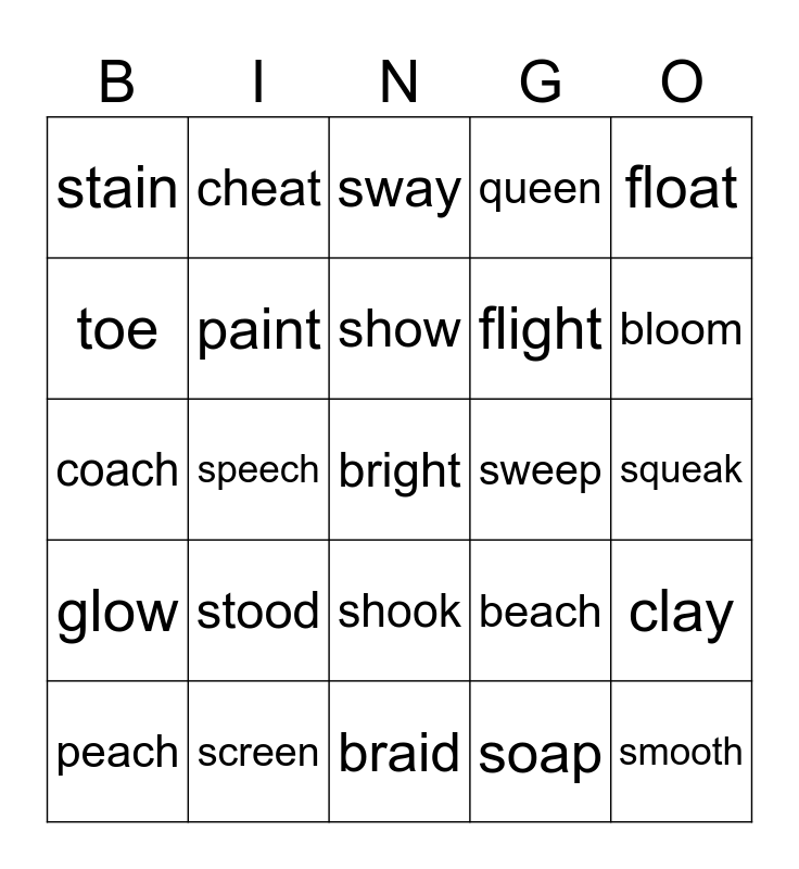 This bingo card has a free space and 24 words: stood, screen, show, peach, float, stain, toe, cheat, sweep, shook, flight, coach, beach, clay, paint, soap, squeak, sway, bloom, speech, smooth, glow, queen and braid.