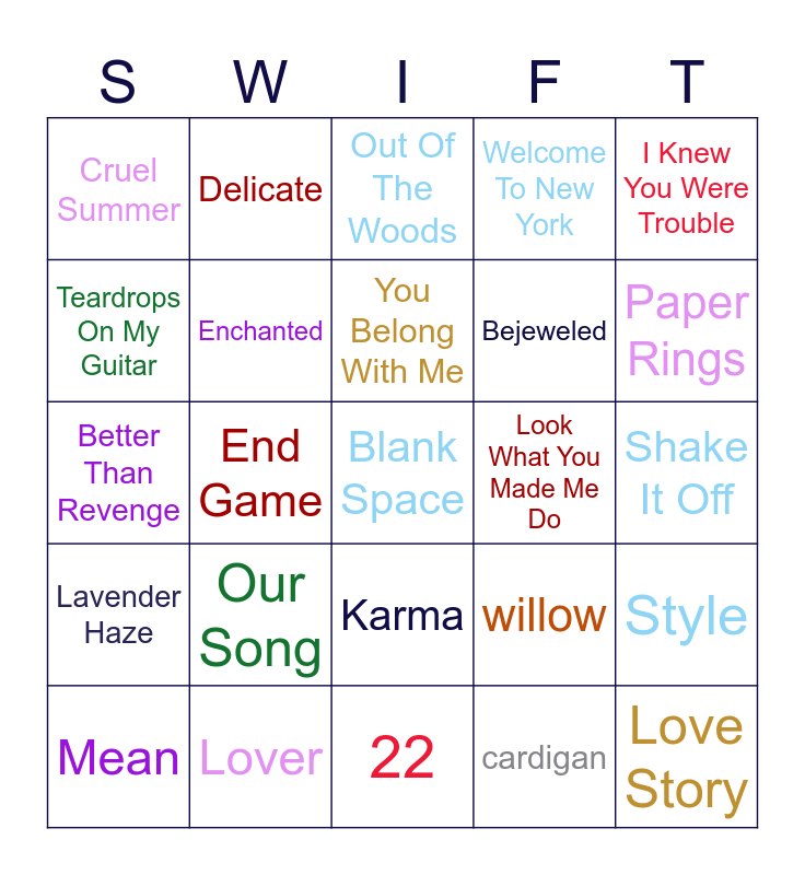 This bingo card has a free space and 24 words: Our Song, Lover, You Belong With Me, Mean, I Knew You Were Trouble, Cruel Summer, Teardrops On My Guitar, Delicate, Look What You Made Me Do, Karma, Bejeweled, Better Than Revenge, willow, Style, Enchanted, cardigan, Shake It Off, Out Of The Woods, Paper Rings, End Game, Love Story, Lavender Haze, Welcome To New York and 22.