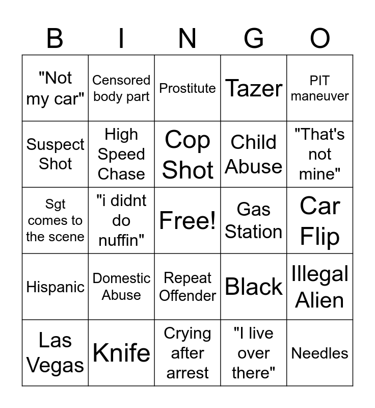 This bingo card has a free space and 44 words: Visible Firearm, Needles, Narcotics, Las Vegas, "Can I have Water", "I live over there", Prostitute, Helicopter, PIT maneuver, Knife, Tazer, Gas Station, Repeat Offender, Domestic Abuse, Shirtless, Crying after arrest, Peirce County, Sgt comes to the scene, K-9, "That's not mine", Censored body part, Foot Chase, No Identification, "Not my car", Shots Fired, Car Flip, Fence Hop, Face Tattoos, Black, Hispanic, Drunk Driving, Illegal Alien, Crack House, Sexual Assault / Rape, "i didnt do nuffin", Window Broken, Excessive Bleeding, Resisting, Cop Shot, Suspect Shot, Child Abuse, Cross-dresser, High Speed Chase and Speed Trap.
