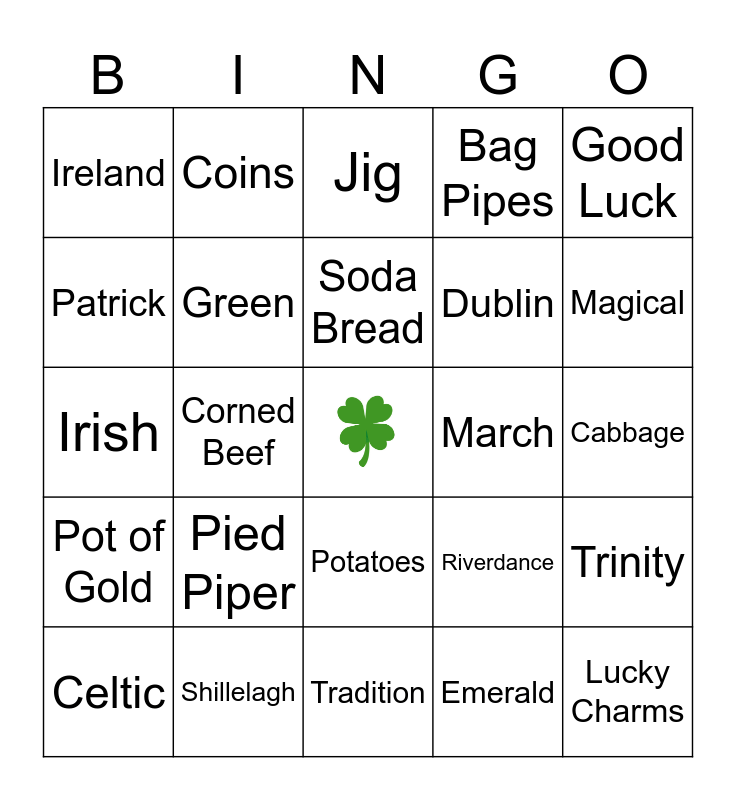 This bingo card has a free space and 40 words: Celebrate, Irish, Rainbow, Green, Shillelagh, Potatoes, Soda Bread, Snakes, Good Luck, Pot of Gold, Corned Beef, Bag Pipes, Lucky Charms, Cabbage, March, Pied Piper, Gosh & Begorah, Ireland, Seventeenth, Jig, Trinity, Emerald, Dublin, Patrick, Erin go Braugh, Four-leaf-clover, Danny Boy, Blarney Stone, Leprechaun, Pinch, Parade, Celtic, Shamrock, Riverdance, Magical, Tradition, Beads, Treasure, Coins and Dance.