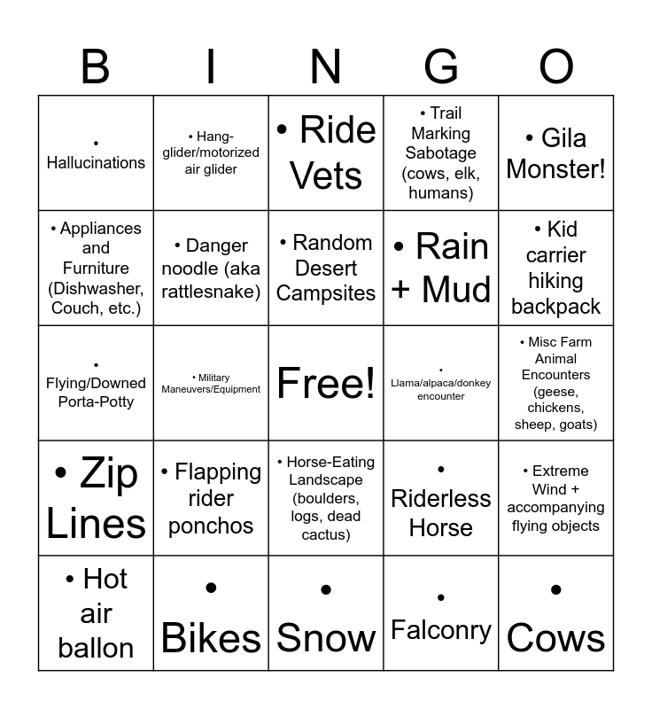 This bingo card has a free space and 41 words: • Ride Photographers, • Flying/Downed Porta-Potty, • Angry Wild Animals (moose, beaver, alligator, bear), • Danger noodle (aka rattlesnake), • Bikes, • Horse-Eating Landscape (boulders, logs, dead cactus), • Random Desert Campsites, • Dogs, • Gila Monster!, • Zip Lines, • Military Maneuvers/Equipment, • Trail Marking Sabotage (cows, elk, humans), • Cows, • Misc Farm Animal Encounters (geese, chickens, sheep, goats), • Llama/alpaca/donkey encounter, • Flapping rider ponchos, • Bouncing Water Scoop, • Hallucinations, • Helicopters, • Ride Vets, • Extreme Wind + accompanying flying objects, • Water Obstacle, • Snow, • Rain + Mud, • Helicopter Landing, • Wildfire, • Falconry, • Rider Falling in Water Trough, • Kid carrier hiking backpack, • Drones, • RC plane, • Hang-glider/motorized air glider, • Hot air ballon, • Horseless Rider, • Riderless Horse, • Appliances and Furniture (Dishwasher, Couch, etc.), • Rider Going the Wrong Way, • Dropped/Abandoned Clothing, • Deployed Air Vest, • Horse being Ponied and • Found Shoe/Boot.