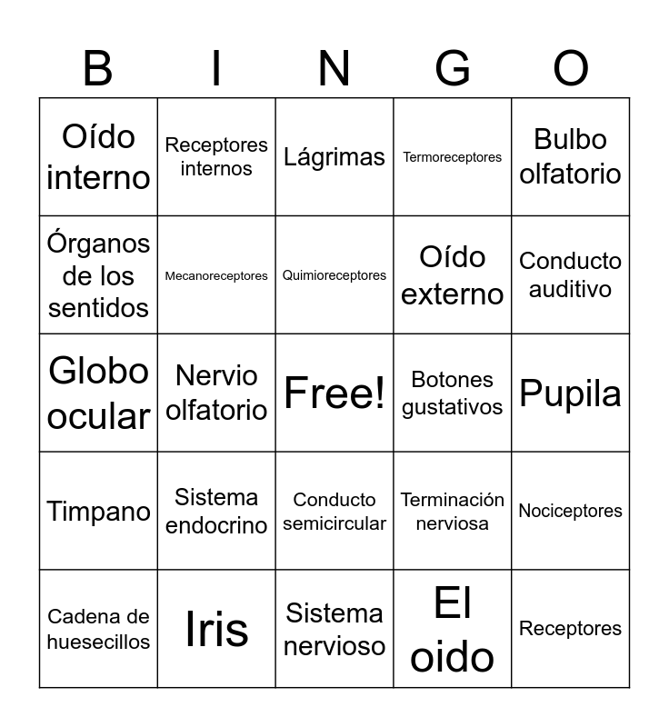 This bingo card has a free space and 46 words: Relación, Receptores, Centres de coordinaciœn, Sistema nervioso, Sistema endocrino, Efectores, Receptores internos, Receptores externos, Órganos de los sentidos, El tacto, Mecanoreceptores, Termoreceptores, Nociceptores, Terminación nerviosa, El gusto, El olfato, Quimioreceptores, Botones gustativos, Papilas, Bulbo olfatorio, Nervio olfatorio, El oido, Oído interno, Oído externo, Oído intermedio, Conducto auditivo, Cadena de huesecillos, Cóclea (Caragol), Conducto semicircular, Timpano, Células auditivas, Células del equilibrio, Nervio auditivo, Conjuntiva, Córnea, Iris, Pupila, Cristalino, Humor vitreo, Retina, Confós y bastones, Lágrimas, Globo ocular, Órganos anexos, Fotoreceptores and Nervio óptico.
