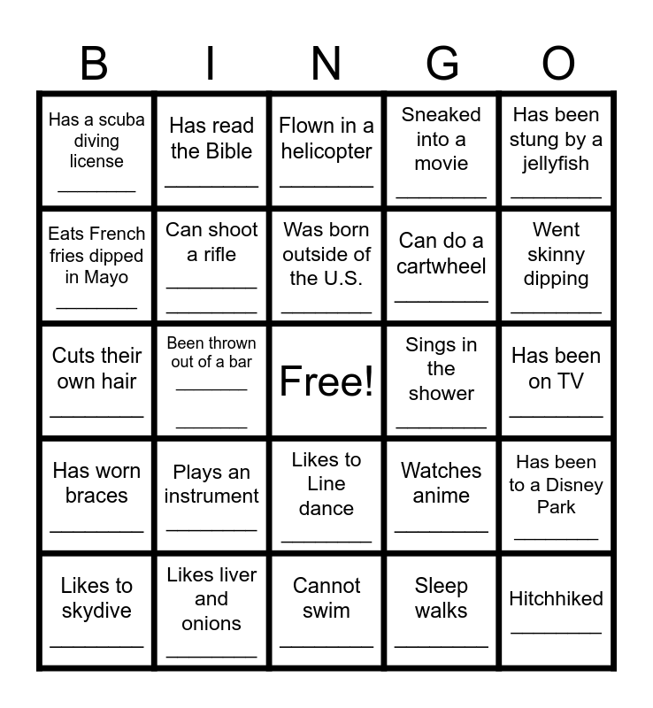 This bingo card has a free space and 24 words: Plays an instrument ________, Likes liver and onions ________, Was born outside of the U.S. ________, Likes to skydive ________, Has been stung by a jellyfish ________, Has a scuba diving license ________, Eats French fries dipped in Mayo ________, Has read the Bible ________, Sings in the shower ________, Likes to Line dance ________, Can do a cartwheel ________, Cuts their own hair ________, Watches anime ________, Has been to a Disney Park ________, Can shoot a rifle ________ ________, Sleep walks ________, Has been on TV ________, Flown in a helicopter ________, Went skinny dipping ________, Been thrown out of a bar ________ ________, Hitchhiked ________, Has worn braces ________, Sneaked into a movie ________ and Cannot swim ________.