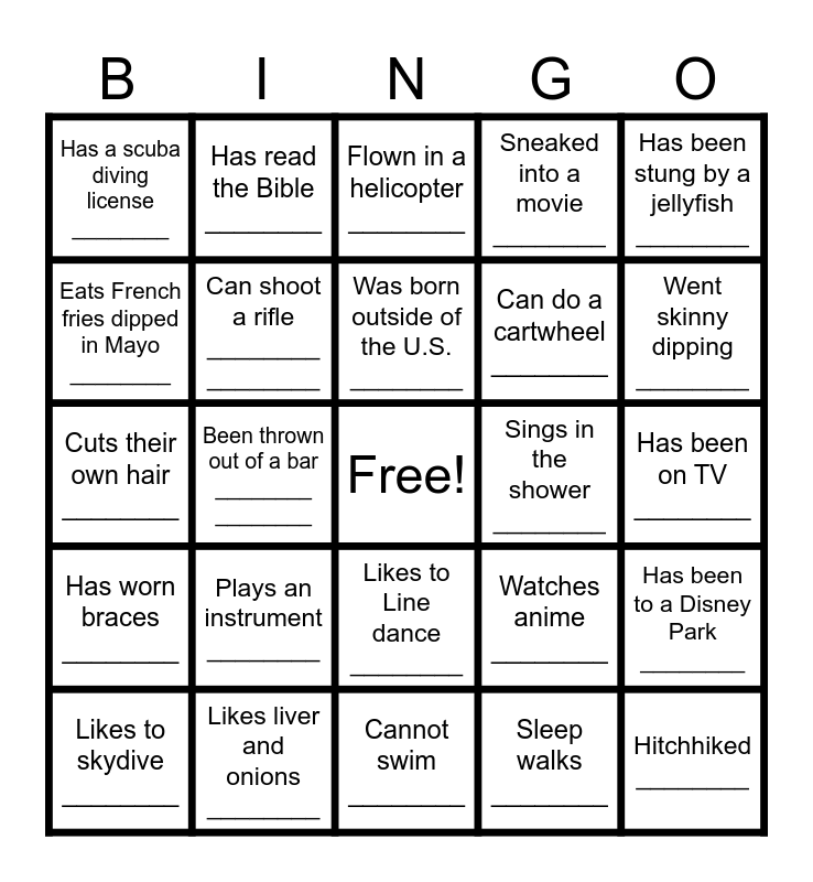 This bingo card has a free space and 24 words: Plays an instrument ________, Likes liver and onions ________, Was born outside of the U.S. ________, Likes to skydive ________, Has been stung by a jellyfish ________, Has a scuba diving license ________, Eats French fries dipped in Mayo ________, Has read the Bible ________, Sings in the shower ________, Likes to Line dance ________, Can do a cartwheel ________, Cuts their own hair ________, Watches anime ________, Has been to a Disney Park ________, Can shoot a rifle ________ ________, Sleep walks ________, Has been on TV ________, Flown in a helicopter ________, Went skinny dipping ________, Been thrown out of a bar ________ ________, Hitchhiked ________, Has worn braces ________, Sneaked into a movie ________ and Cannot swim ________.