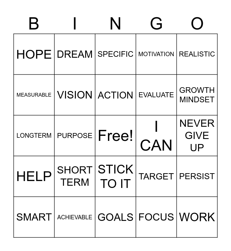 This bingo card has a free space and 24 words: SHORT TERM, ACHIEVABLE, ACTION, SMART, REALISTIC, HOPE, MEASURABLE, DREAM, I CAN, STICK TO IT, EVALUATE, LONGTERM, TARGET, PERSIST, VISION, FOCUS, NEVER GIVE UP, SPECIFIC, GROWTH MINDSET, PURPOSE, WORK, HELP, MOTIVATION and GOALS.