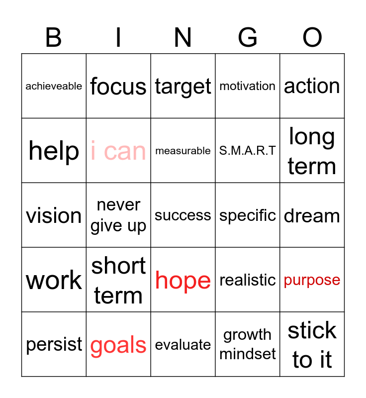 This bingo card has a free space and 24 words: short term, goals, measurable, persist, action, achieveable, help, focus, specific, hope, S.M.A.R.T, vision, realistic, purpose, i can, growth mindset, dream, target, long term, never give up, stick to it, work, motivation and evaluate.
