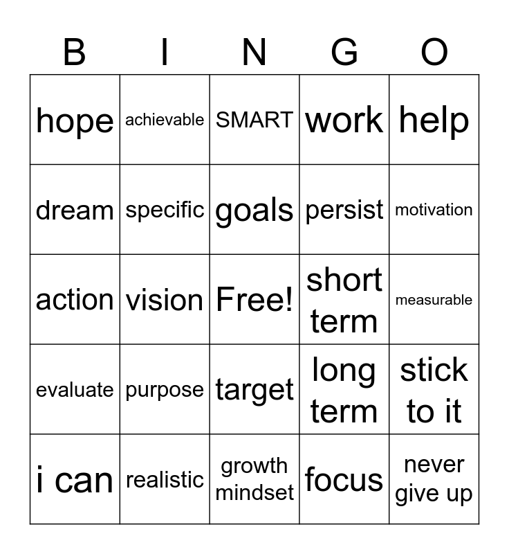 This bingo card has a free space and 24 words: purpose, realistic, goals, i can, help, hope, dream, achievable, short term, target, persist, action, long term, stick to it, specific, focus, measurable, SMART, motivation, vision, never give up, evaluate, work and growth mindset.