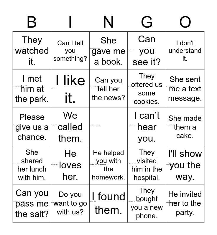 This bingo card has 22 images, a free space and 24 words: He loves her., Do you want to go with us?, Can you tell her the news?, Can you pass me the salt?, I don't understand it., They watched it., I met him at the park., Can I tell you something?, I can’t hear you., He helped you with the homework., They offered us some cookies., Please give us a chance., They visited him in the hospital., I'll show you the way., I like it., They bought you a new phone., She made them a cake., She gave me a book., She sent me a text message., We called them., He invited her to the party., She shared her lunch with him., Can you see it? and I found them..