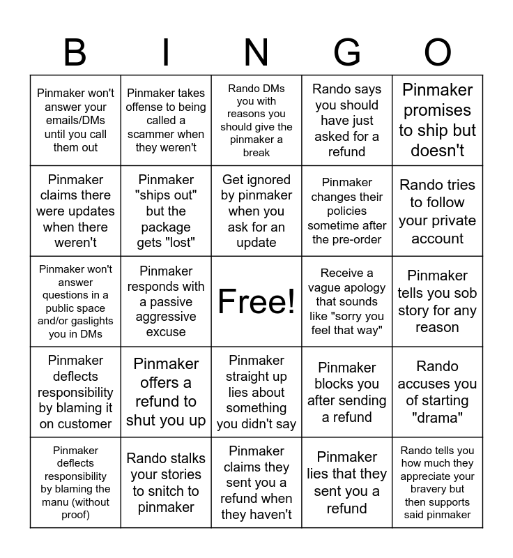 This bingo card has a free space and 24 words: Pinmaker offers a refund to shut you up, Rando stalks your stories to snitch to pinmaker, Get ignored by pinmaker when you ask for an update, Pinmaker deflects responsibility by blaming the manu (without proof), Pinmaker promises to ship but doesn't, Pinmaker won't answer your emails/DMs until you call them out, Pinmaker claims there were updates when there weren't, Pinmaker takes offense to being called a scammer when they weren't, Receive a vague apology that sounds like "sorry you feel that way", Pinmaker straight up lies about something you didn't say, Pinmaker changes their policies sometime after the pre-order, Pinmaker won't answer questions in a public space and/or gaslights you in DMs, Pinmaker blocks you after sending a refund, Rando accuses you of starting "drama", Pinmaker "ships out" but the package gets "lost", Pinmaker lies that they sent you a refund, Pinmaker tells you sob story for any reason, Rando DMs you with reasons you should give the pinmaker a break, Rando tries to follow your private account, Pinmaker responds with a passive aggressive excuse, Rando tells you how much they appreciate your bravery but then supports said pinmaker, Pinmaker deflects responsibility by blaming it on customer, Rando says you should have just asked for a refund and Pinmaker claims they sent you a refund when they haven't.