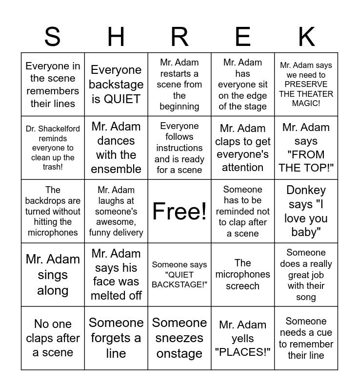 This bingo card has a free space and 24 words: Mr. Adam says his face was melted off, Someone forgets a line, Everyone follows instructions and is ready for a scene, No one claps after a scene, Mr. Adam says we need to PRESERVE THE THEATER MAGIC!, Everyone in the scene remembers their lines, Dr. Shackelford reminds everyone to clean up the trash!, Everyone backstage is QUIET, Someone has to be reminded not to clap after a scene, Someone says "QUIET BACKSTAGE!", Mr. Adam claps to get everyone's attention, The backdrops are turned without hitting the microphones, The microphones screech, Someone does a really great job with their song, Mr. Adam dances with the ensemble, Mr. Adam yells "PLACES!", Donkey says "I love you baby", Mr. Adam restarts a scene from the beginning, Mr. Adam says "FROM THE TOP!", Mr. Adam laughs at someone's awesome, funny delivery, Someone needs a cue to remember their line, Mr. Adam sings along, Mr. Adam has everyone sit on the edge of the stage and Someone sneezes onstage.