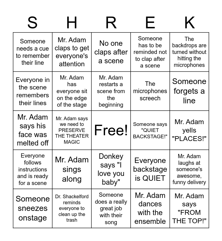 This bingo card has a free space and 24 words: Mr. Adam sings along, Dr. Shackelford reminds everyone to clean up the trash, Mr. Adam restarts a scene from the beginning, Someone sneezes onstage, The backdrops are turned without hitting the microphones, Someone needs a cue to remember their line, Everyone in the scene remembers their lines, Mr. Adam claps to get everyone's attention, Someone says "QUIET BACKSTAGE!", Donkey says "I love you baby", The microphones screech, Mr. Adam says his face was melted off, Everyone backstage is QUIET, Mr. Adam laughs at someone's awesome, funny delivery, Mr. Adam has everyone sit on the edge of the stage, Mr. Adam dances with the ensemble, Mr. Adam yells "PLACES!", No one claps after a scene, Someone forgets a line, Mr. Adam says we need to PRESERVE THE THEATER MAGIC, Mr. Adam says "FROM THE TOP!", Everyone follows instructions and is ready for a scene, Someone has to be reminded not to clap after a scene and Someone does a really great job with their song.