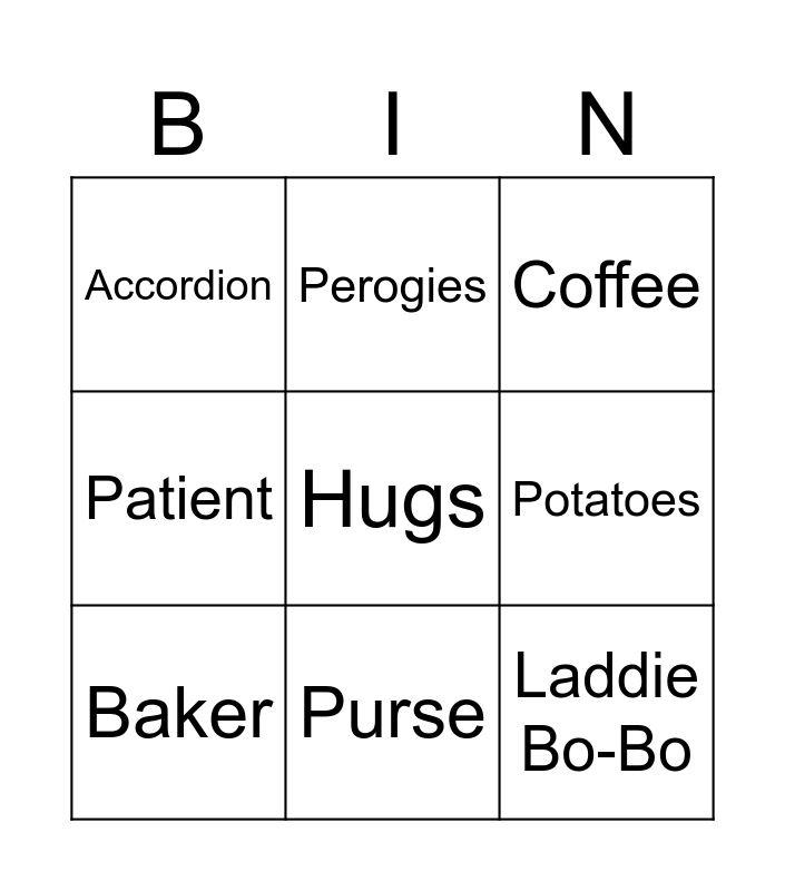 This bingo card has 1 images and 36 words: Dump trips, St. Patrick's Day, 80th, Baker, Jokes, Expired food, Purse, Singing, Hugs, Smiles, Mushroom Pot, Patient, Thrift stores, Austin, Meatballs, Accordion, Birthday, Crumble, Nana, Coffee, Singing, Church, Giving, Subway, Clearance, Perogies, Happy, Tops, Laddie Bo-Bo, Potatoes, Kenora, Super Fluity, Shopping, Chili, Thunder Bay and Books.