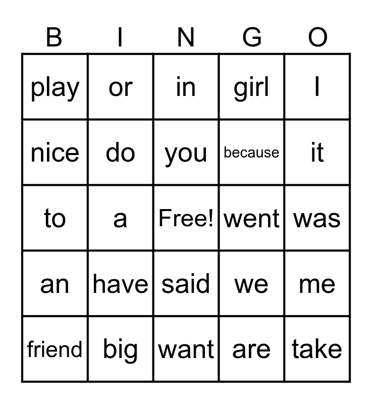 This bingo card has a free space and 27 words: we, be, because, want, nice, in, or, an, went, me, to, girl, friend, big, it, my, do, you, have, play, was, are, a, take, said, I and here.