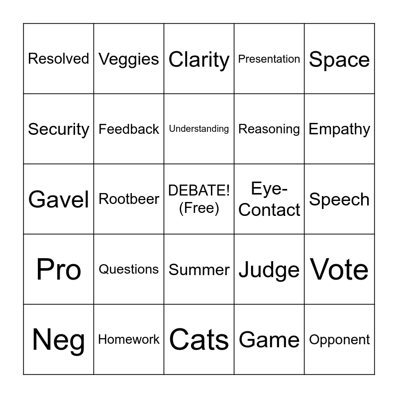 This bingo card has a free space and 66 words: Yes, Winter, Win, Vote, Volume, Video Games, Veggies, Values, Understanding, Thanks, Summer, Stand, Speech, Space, Skills, Security, Rootbeer, Resolved, Research, Reasoning, Questions, Pro, Presentation, Posture, Perspective, Pen, Paper, Pace, Opponent, No, Neg, Movement, Lose, Listening, Judge, Homework, Hand Gestures, Gavel, Game, Fruits, Feedback, Facial Expressions, Eye-Contact, Evidence, Environment, Emphasis, Empathy, Emotion, Economic, Dr. Pepper, Dogs, Decisions, Courage, Confidence, Con, Competition, Communism, Communication, Clarity, Cats, Capitalism, Brainstorm, Board Games, Athletes, Aff and A.I..