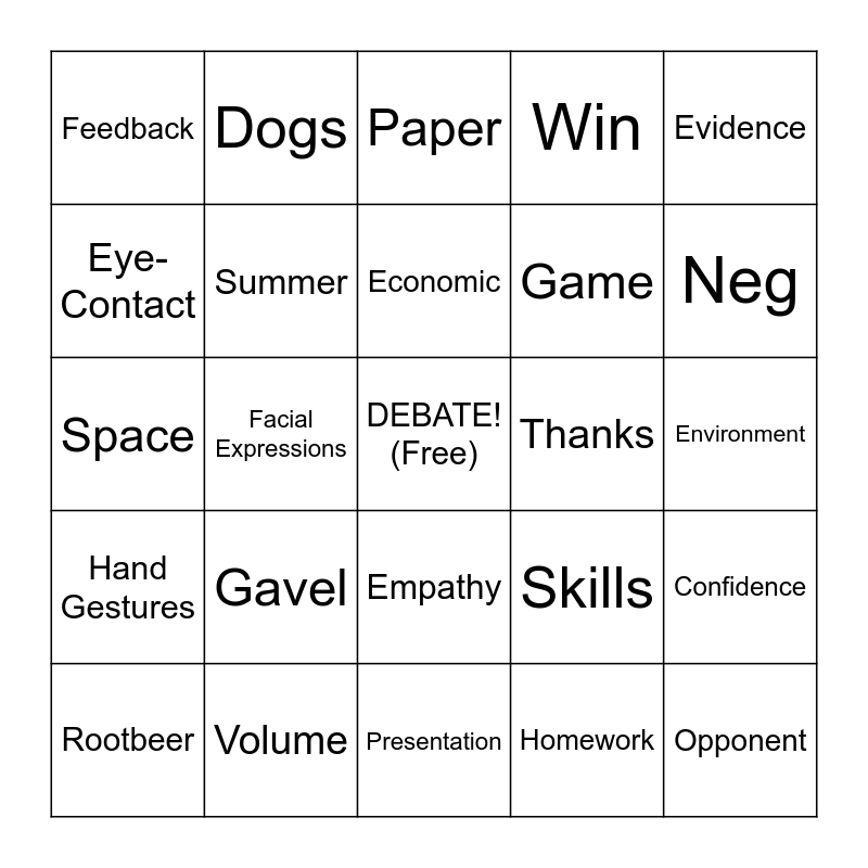 This bingo card has a free space and 67 words: Communism, Competition, Con, Confidence, Courage, Decisions, Dogs, Dr. Pepper, Economic, Emotion, Empathy, Emphasis, Environment, Evidence, Aff, Eye-Contact, Facial Expressions, Feedback, Fruits, Game, Gavel, Hand Gestures, Win, Homework, Judge, Listening, Lose, Movement, Neg, No, Opponent, Winter, Reasoning, Research, Resolved, Rootbeer, Security, Skills, Space, Speech, Stand, Summer, Thanks, Understanding, Values, Veggies, Video Games, Volume, Vote, Pace, Paper, Pen, Perspective, Posture, Yes, Presentation, Pro, Questions, Argument, Athletes, Board Games, Brainstorm, Capitalism, Cats, Clarity, A.I. and Communication.