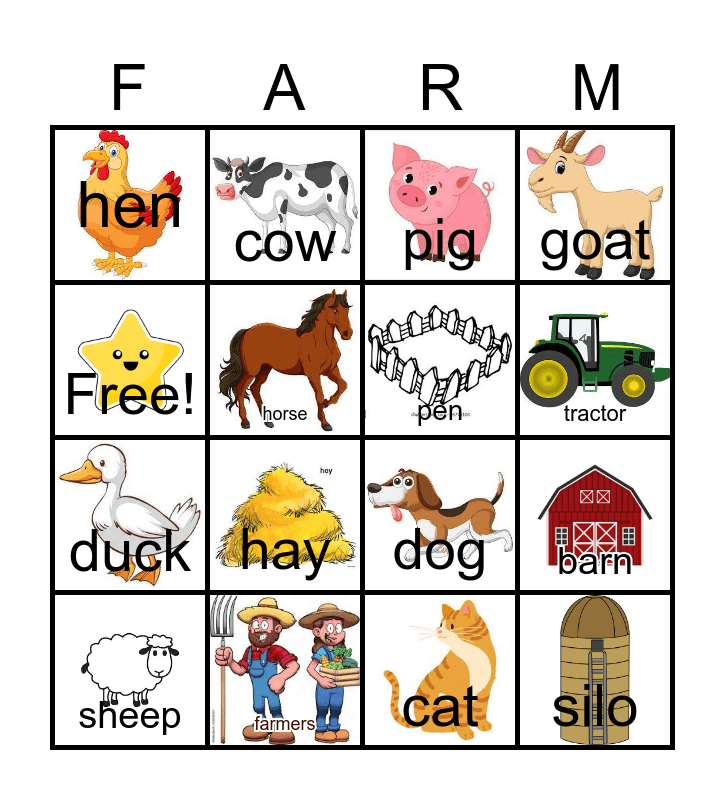 This bingo card has 16 images and 16 words: farmers, barn, pig, hen, duck, cow, dog, cat, Free!, horse, sheep, goat, hay, tractor, pen and silo.