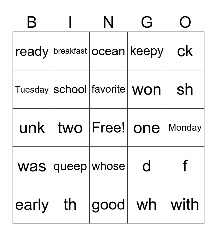 This bingo card has a free space and 24 words: queep, th, favorite, early, ck, ready, Tuesday, breakfast, one, whose, won, unk, d, f, school, wh, Monday, ocean, sh, two, with, was, keepy and good.