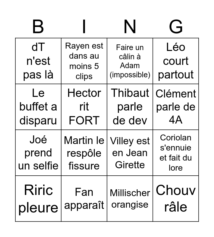 This bingo card has 17 words: Millischer orangise, Riric pleure, Faire un câlin à Adam (impossible), dT n'est pas là, Martin le respôle fissure, Léo court partout, Coriolan s'ennuie et fait du lore, Thibaut parle de dev, Clément parle de 4A, Hector rit FORT, Fan apparaît, Villey est en Jean Girette, Le buffet a disparu, Rayen est dans au moins 5 clips, Joé prend un selfie, Un jour j'irai en section bad passe and Chouv râle.