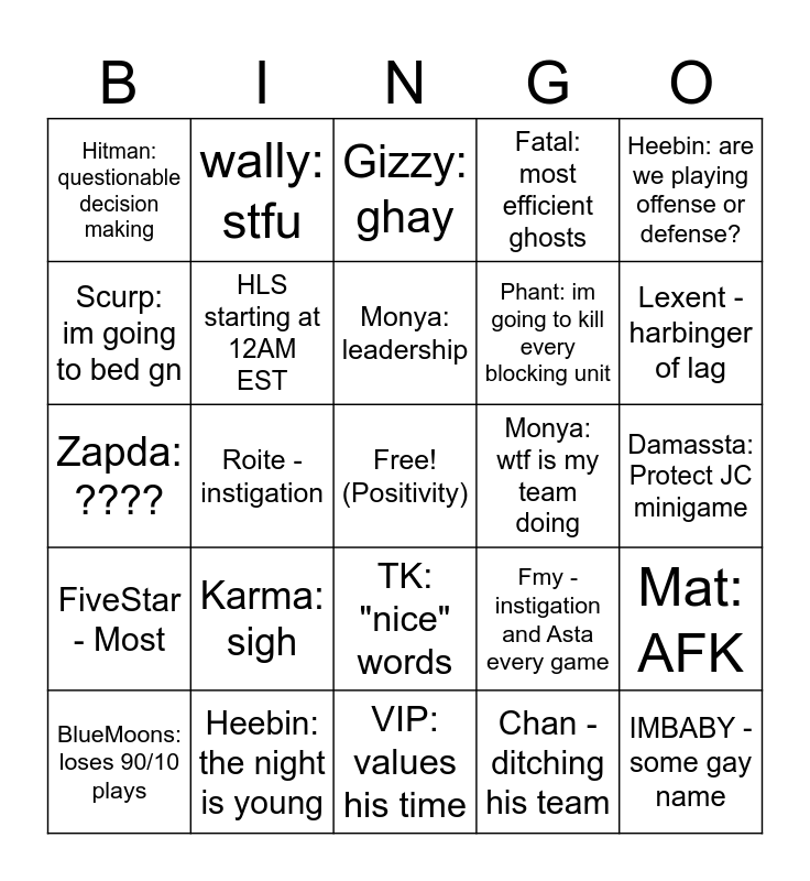 This bingo card has a free space and 24 words: Karma: sigh, Heebin: the night is young, Monya: leadership, BlueMoons: loses 90/10 plays, Heebin: are we playing offense or defense?, Hitman: questionable decision making, Scurp: im going to bed gn, wally: stfu, Monya: wtf is my team doing, TK: "nice" words, Phant: im going to kill every blocking unit, Zapda: ????, Fmy - instigation and Asta every game, Mat: AFK, HLS starting at 12AM EST, Chan - ditching his team, Damassta: Protect JC minigame, Gizzy: ghay, Lexent - harbinger of lag, Roite -instigation, IMBABY - some gay name, FiveStar - Most, Fatal: most efficient ghosts and VIP: values his time.