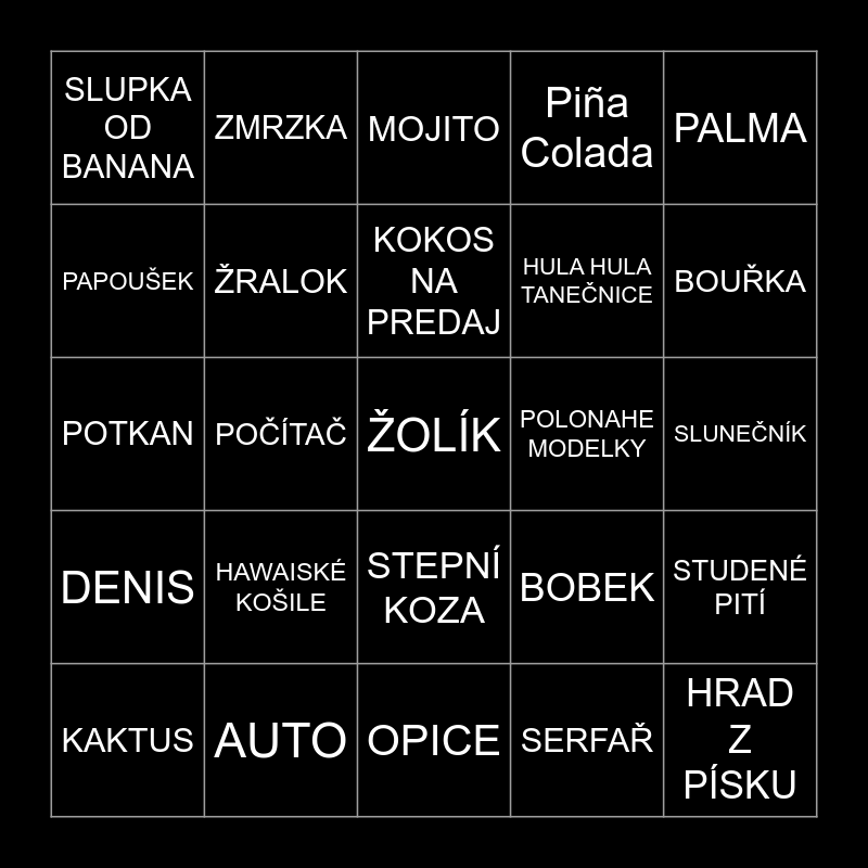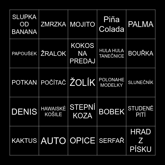 This bingo card has a free space and 24 words: HAWAISKÉ KOŠILE, AUTO, KOKOS NA PREDAJ, KAKTUS, PALMA, SLUPKA OD BANANA, PAPOUŠEK, ZMRZKA, POLONAHE MODELKY, STEPNÍ KOZA, HULA HULA TANEČNICE, POTKAN, BOBEK, STUDENÉ PITÍ, ŽRALOK, SERFAŘ, SLUNEČNÍK, MOJITO, BOUŘKA, POČÍTAČ, HRAD Z PÍSKU, DENIS, Piña Colada and OPICE.