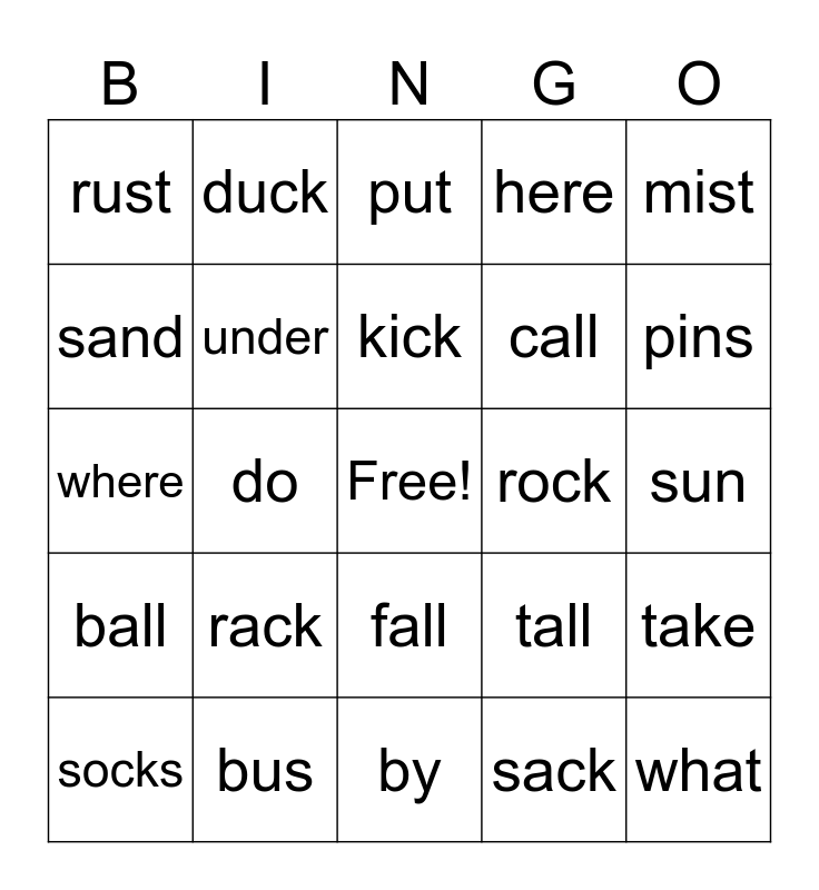 This bingo card has a free space and 24 words: rack, bus, kick, socks, mist, rust, sand, duck, rock, fall, call, where, tall, take, under, sack, sun, put, pins, do, what, ball, here and by.