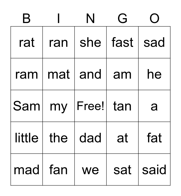 This bingo card has a free space and 24 words: the, fan, and, mad, sad, rat, ram, ran, tan, dad, am, Sam, at, fat, mat, sat, a, she, he, my, said, little, fast and we.