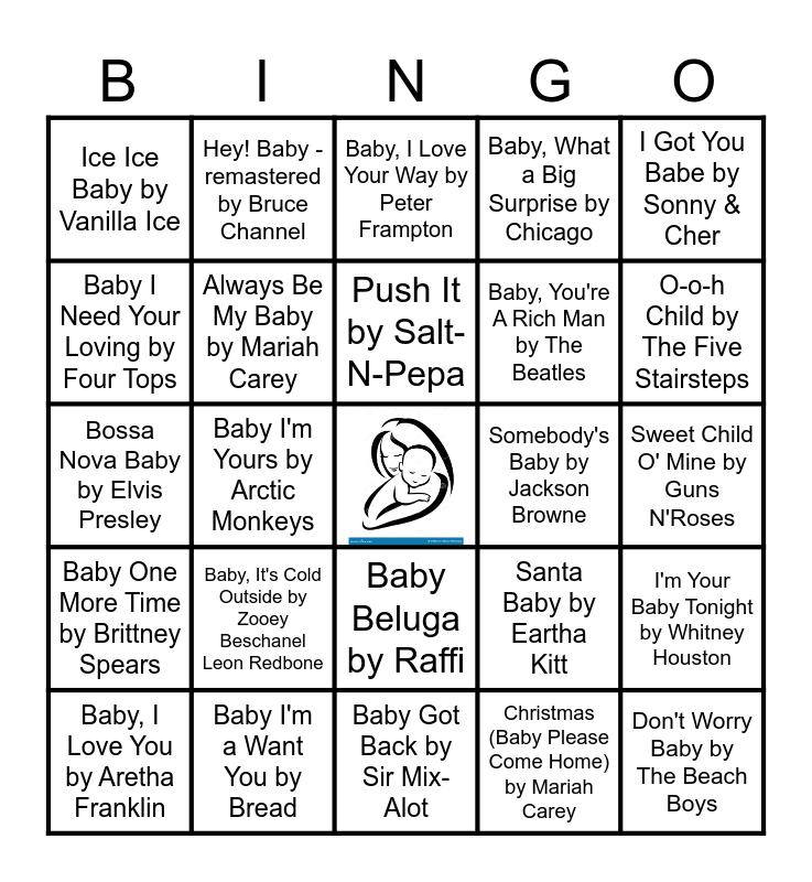 This bingo card has a free space and 44 words: Baby Hold On(2022 Remaster by Eddie Money), Don't Worry Baby by The Beach Boys, Be My Baby by The Ronettes, Baby, I Love You by Aretha Franklin, Be My Baby Tonight by John Michael Montgomery, Christmas (Baby Please Come Home) by Mariah Carey, Baby, I Love Your Way by Peter Frampton, Take Good Care of My Baby by Bobby Vee, I Got You Babe by Sonny & Cher, Baby I'm a Want You by Bread, Baby, What a Big Surprise by Chicago, Somebody's Baby by Jackson Browne, Baby Beluga by Raffi, Baby, It's Cold Outside by Zooey Beschanel Leon Redbone, Hush Little Baby by The Kiboomers, Baby Got Back by Sir Mix-Alot, There Goes My Baby by The Drifters, Bossa Nova Baby by Elvis Presley, Baby Shark by Pinkfang, O-o-h Child by The Five Stairsteps, Hey! Baby - remastered by Bruce Channel, Rockabye Baby by The Kiboomers, Sweet Baby James by James Taylor, Ice Ice Baby by Vanilla Ice, Can't Get Enough of you Baby by Frankie Valli & The Four Seasons, Sweet Child O' Mine by Guns N'Roses, Baby by Justin Bieber, Steppin' Out With My Baby by Fred Astaire, Santa Baby by Eartha Kitt, Baby One More Time by Brittney Spears, Baby, Baby by Amy Grant, I'm Your Baby Tonight by Whitney Houston, Baby Come Back by Player, Baby Bumblebee by The Kiboomers, Baby I'm Yours by Arctic Monkeys, Ohh, Baby, Baby by Shalamar, Baby Love by The Supremes, All That She Wants by Ace of Base, Push It by Salt-N-Pepa, Baby I Need Your Loving by Four Tops, Baby, You're A Rich Man by The Beatles, Baby Now That I've Found You by The Foundations, Always Be My Baby by Mariah Carey and Baby Don't Forget My Number by Milli Vanilli.