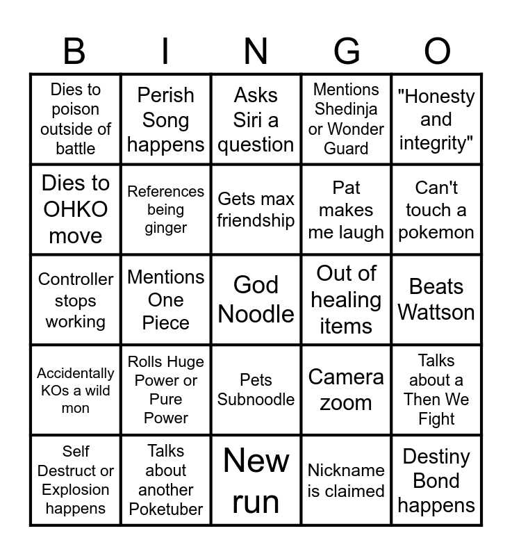 This bingo card has 38 words: Free!, Says something in Japanese, Beats Roxanne, References being ginger, Talks about a Then We Fight, Rolls Huge Power or Pure Power, Gets max friendship, Finds Master Ball, "Honesty and integrity", Pat makes me laugh, Mentions One Piece, Mentions Shedinja or Wonder Guard, God Noodle, Beats Wattson, Dies to OHKO move, Accidentally KOs a wild mon, "Chat type 1", Asks Siri a question, 20+ gifted by a single person, Out of healing items, Dies to poison outside of battle, Talks about another Poketuber, Can't touch a pokemon, Self Destruct or Explosion happens, Uses a Mega Evolution, New run, Destiny Bond happens, Gamer Supps plug, 5 gifted, Talks about Baldur's Gate 3, Rolls a die, Pets Subnoodle, Nickname is claimed, Perish Song happens, Leo appearance, Camera zoom, Controller stops working and Wheel Spin.