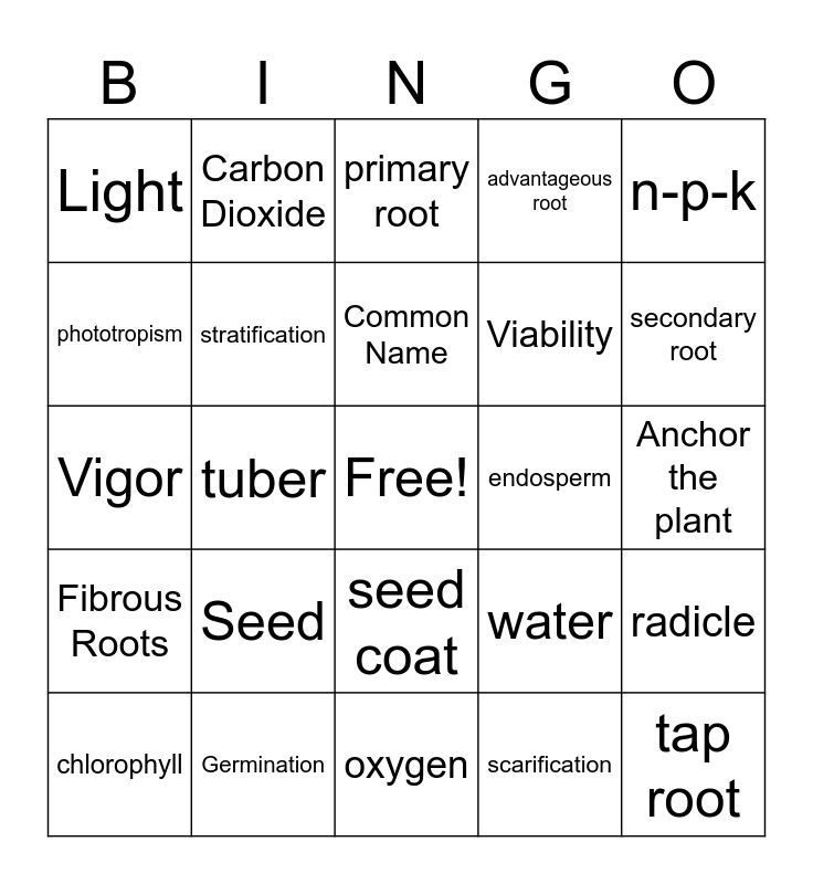 This bingo card has a free space and 24 words: Seed, Germination, Common Name, chlorophyll, n-p-k, Light, phototropism, Carbon Dioxide, endosperm, seed coat, Viability, Vigor, water, radicle, stratification, scarification, Anchor the plant, primary root, secondary root, tuber, tap root, Fibrous Roots, advantageous root and oxygen.
