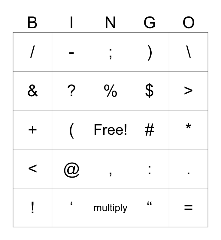 This bingo card has a free space and 24 words: @, ‘, %, !, \, /, &, -, #, ,, $, +, :, ., ?, “, *, ;, >, (, =, <, ) and multiply.