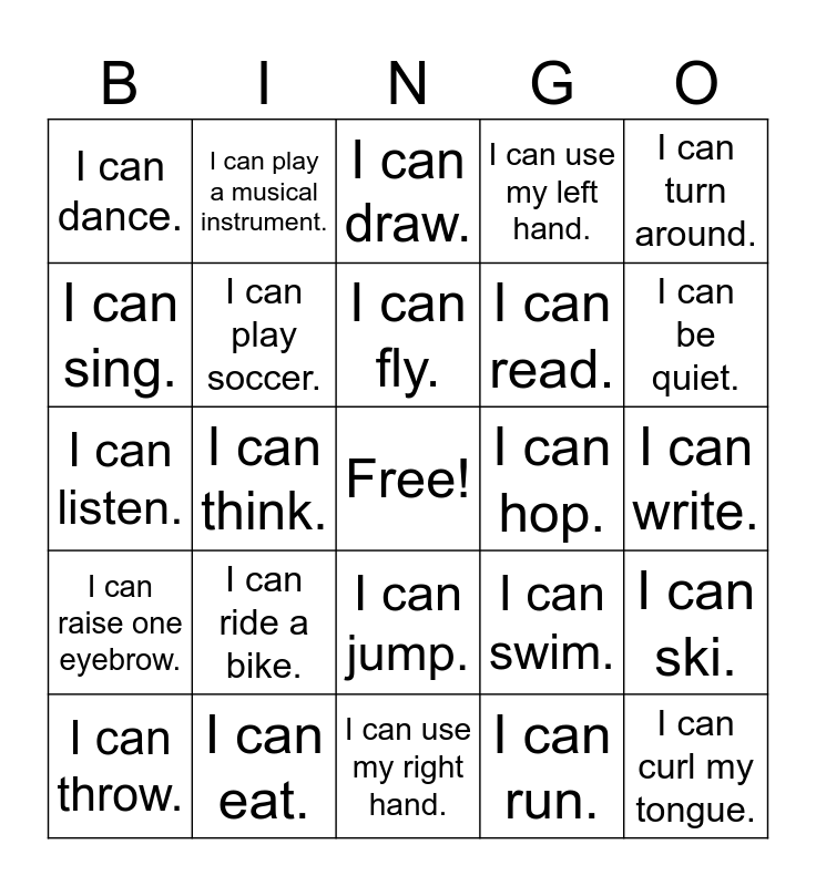 This bingo card has a free space and 24 words: I can ride a bike., I can eat., I can fly., I can throw., I can turn around., I can dance., I can sing., I can play a musical instrument., I can hop., I can jump., I can read., I can listen., I can swim., I can ski., I can play soccer., I can run., I can write., I can draw., I can be quiet., I can think., I can curl my tongue., I can raise one eyebrow., I can use my left hand. and I can use my right hand..