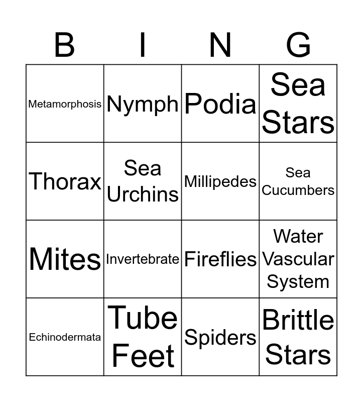 This bingo card has 35 words: Crustaceans, Arachnids, Centipedes, Millipedes, Insects, Sea Stars, Sea Urchins, Sand Dollars, Sea Cucumbers, Grasshoppers, Fireflies, Thorax, Abdomen, Molting, Metamorphosis, Tube Feet, Antennae, Water Vascular System, Brittle Stars, Echinodermata, Arthropods, Bees, Ants, Radial Symmetry, Podia, Invertebrate, Exoskeleton, Scorpions, Mites, Spiders, Egg, Larva, Pupa, Nymph and Adult.