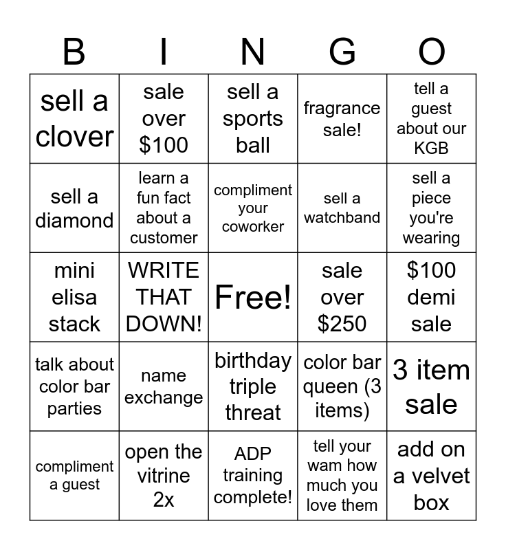 This bingo card has a free space and 24 words: name exchange, open the vitrine 2x, compliment your coworker, compliment a guest, tell a guest about our KGB, sell a clover, sell a diamond, sale over $100, sale over $250, birthday triple threat, sell a watchband, mini elisa stack, color bar queen (3 items), 3 item sale, learn a fun fact about a customer, tell your wam how much you love them, $100 demi sale, sell a sports ball, sell a piece you're wearing, WRITE THAT DOWN!, add on a velvet box, talk about color bar parties, fragrance sale! and ADP training complete!.