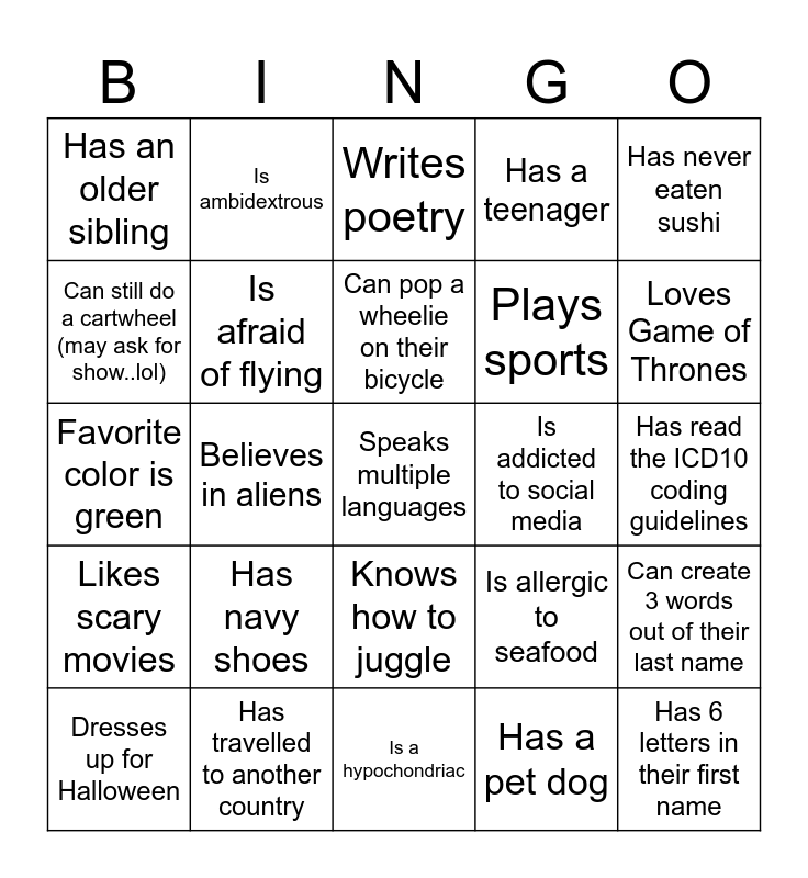 This bingo card has 25 words: Has navy shoes, Is a hypochondriac, Can pop a wheelie on their bicycle, Dresses up for Halloween, Has never eaten sushi, Has an older sibling, Can still do a cartwheel (may ask for show..lol), Is ambidextrous, Is addicted to social media, Knows how to juggle, Plays sports, Favorite color is green, Is allergic to seafood, Can create 3 words out of their last name, Is afraid of flying, Has 6 letters in their first name, Has read the ICD10 coding guidelines, Writes poetry, Loves Game of Thrones, Believes in aliens, Speaks multiple languages, Has travelled to another country, Likes scary movies, Has a teenager and Has a pet dog.