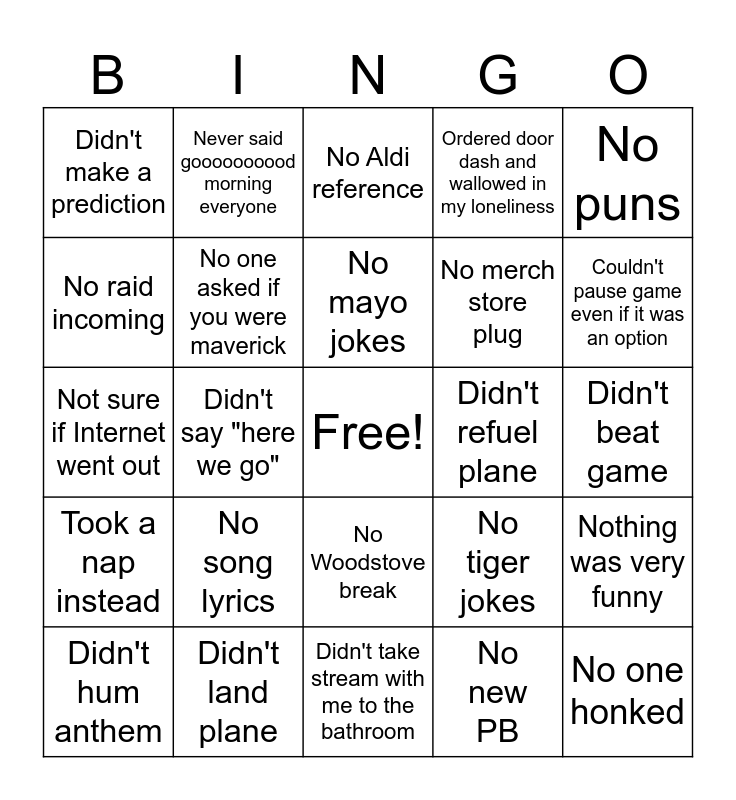 This bingo card has a free space and 24 words: No song lyrics, Didn't land plane, No mayo jokes, Didn't hum anthem, No puns, Didn't make a prediction, No raid incoming, Never said goooooooood morning everyone, Didn't refuel plane, No Woodstove break, No merch store plug, Not sure if Internet went out, No tiger jokes, Nothing was very funny, No one asked if you were maverick, No new PB, Didn't beat game, No Aldi reference, Couldn't pause game even if it was an option, Didn't say "here we go", No one honked, Took a nap instead, Ordered door dash and wallowed in my loneliness and Didn't take stream with me to the bathroom.