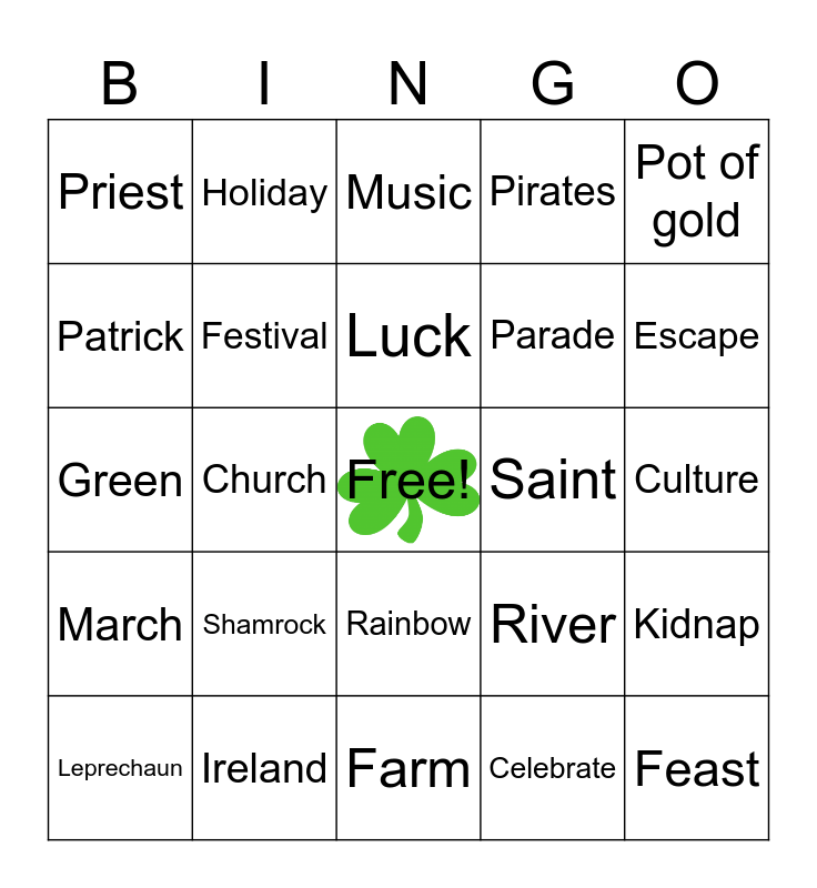 This bingo card has a free space and 24 words: Shamrock, Ireland, Luck, Leprechaun, Pot of gold, Priest, Patrick, Holiday, Saint, Rainbow, Parade, Green, River, Kidnap, Festival, Celebrate, Culture, Music, Escape, Church, Feast, March, Pirates and Farm.
