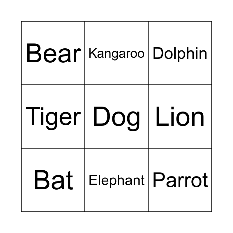 This bingo card has a free space and 9 words: Bat, Dolphin, Kangaroo, Tiger, Bear, Lion, Parrot, Shark and Elephant.